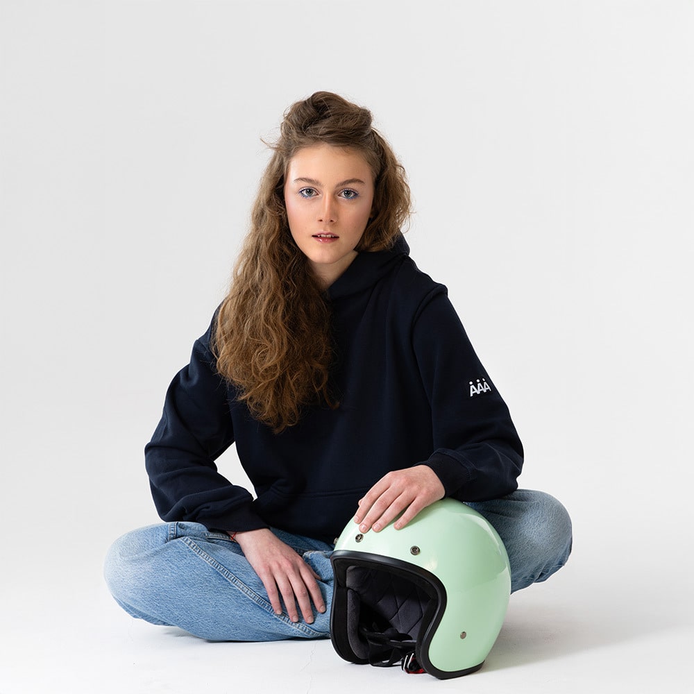 ლურჯი ჰუდი, მხარზე AAA ლოგოთი, ზურგზე დიდი არველაძის ბრენდირებით