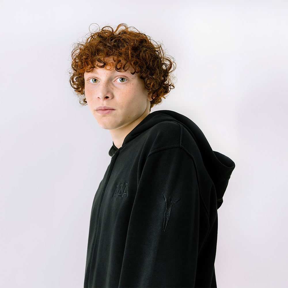 შავი ზიპერიანი ჟაკეტი, წინ AAA ლოგოთი და მარცხენა მხარზე არველაძის ბრენდირებით